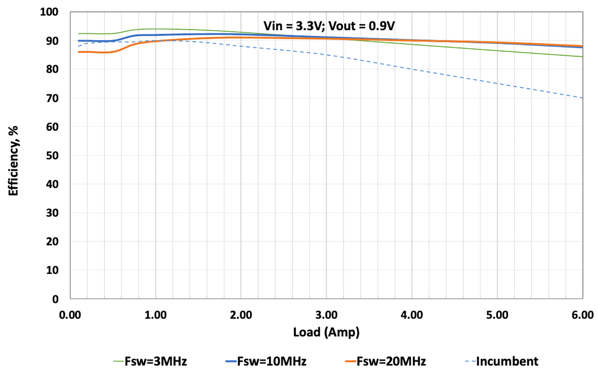 Improving power conversion efficiency for both light and heavy loads means less wasted power, which directly reduces the heat generated. Reduction in heat dissipation of over 50% has been achieved for automotive applications. With efficiency improvements of 6 – 15%, cooling system requirements are significantly reduced. The figure below illustrates efficiency across load for Endura’s platform.
