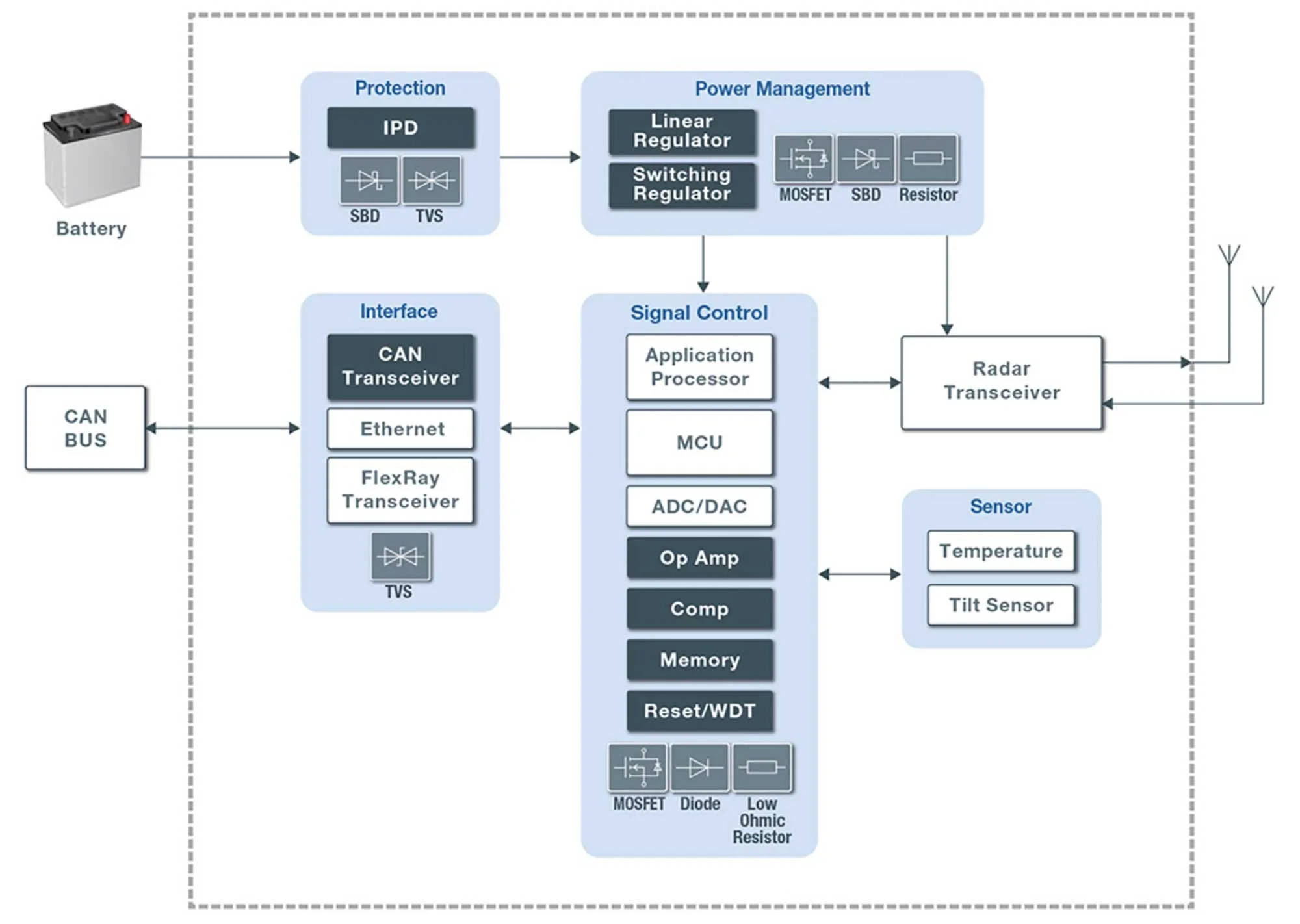 These features can be packaged to deliver various levels of autonomous driving. Two primary functions needed for ADAS are sensors (e.g., radar) and on-board data processing. For the sensor portion, noise and how the power source manages noise is a critical part of the architecture. The diagram below illustrates the various parts of ADAS.