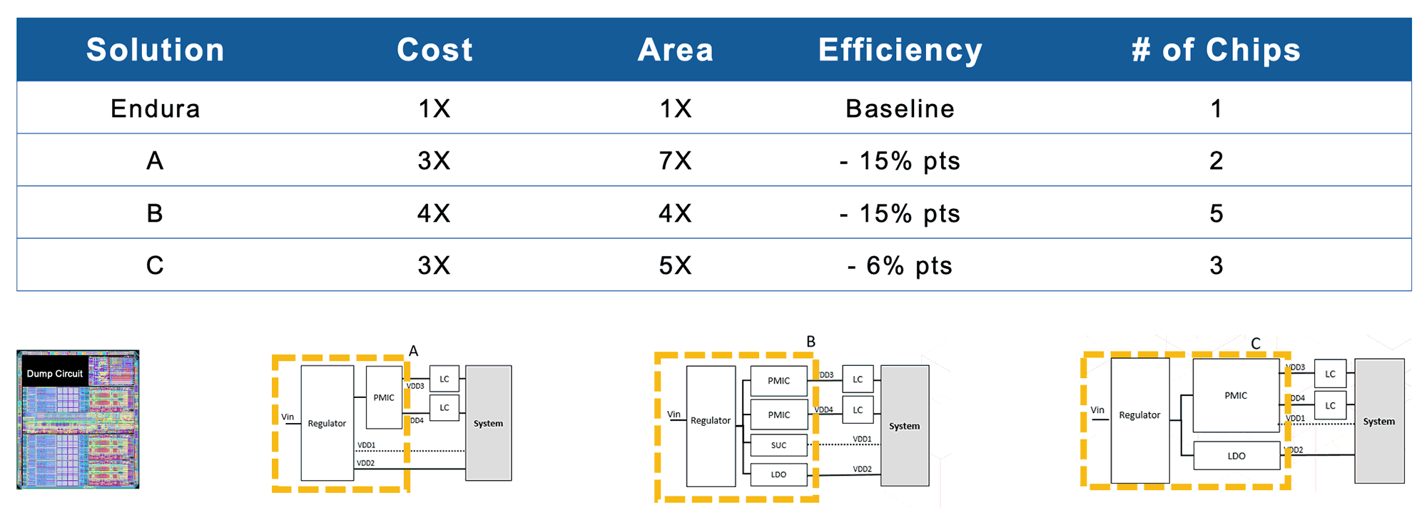 Endura Technologies’ power delivery architecture is ideal for these applications. Endura Technologies’ modular digital control and use of advanced semiconductor process technology enable industry-leading efficiencies and high-speed switching for smaller footprints. This scalable architecture ranges from standard power management devices (sVR) to embedded (eVR) chiplets down to on-chip, integrated (iVR) blocks for optimum point-of-load energy delivery.