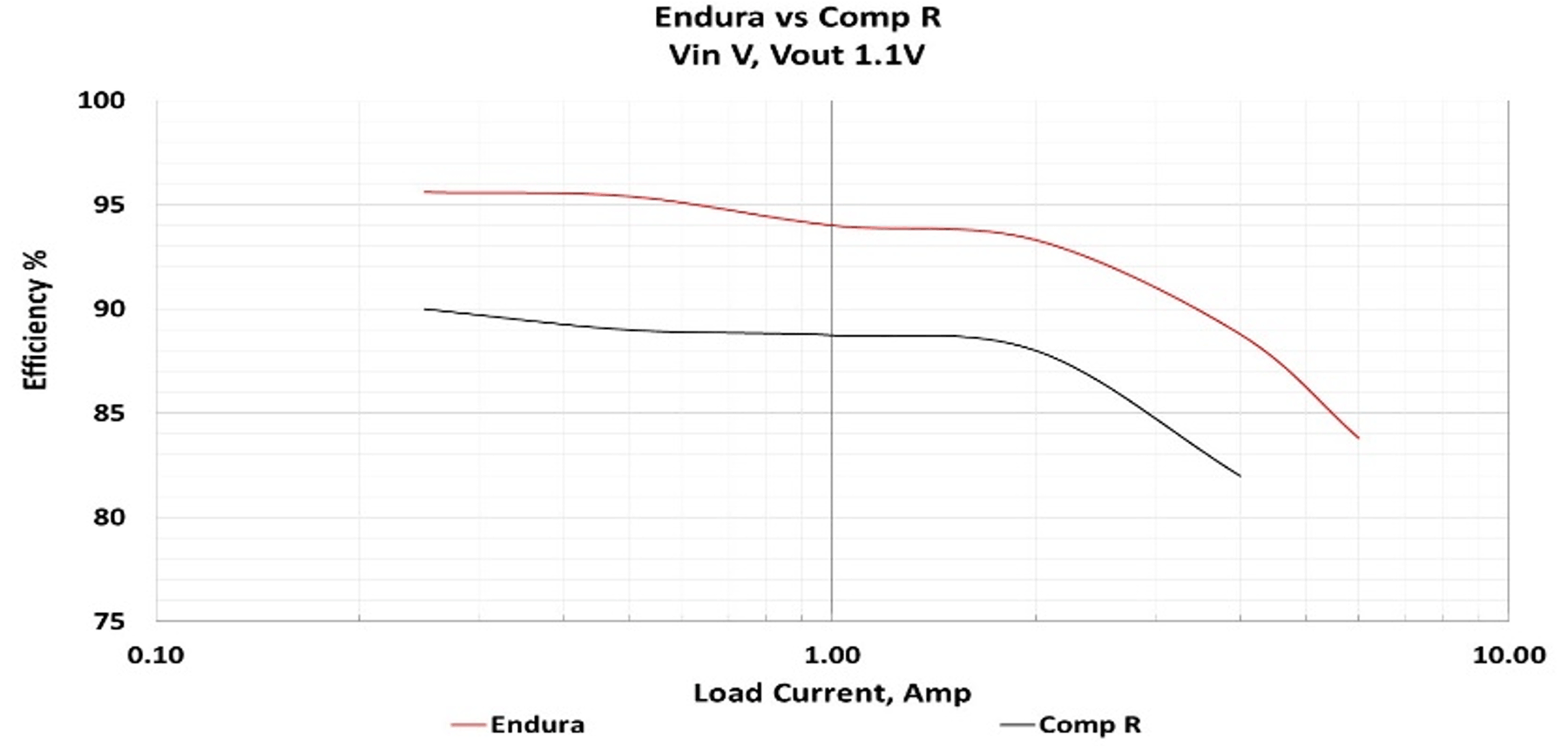 Endura Technologies’ power delivery architecture, implemented on the 55nm process node, is JEDEC5100 compliant and a drop-in replacement for the current PMIC solution. This technology’s high-efficiency voltage conversion technology boosts overall efficiency and reduces the amount of wasted power that dissipates into heat. It is highly scalable and maintains its high efficiency over the full spectrum of amp loads.