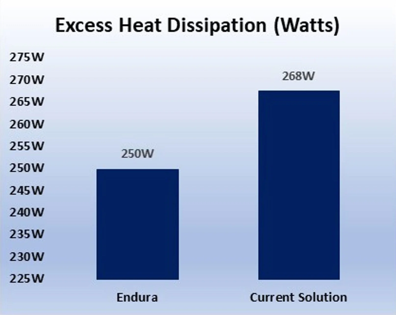 Endura Technologies’ high-efficiency voltage conversion technology drives a full 7% increase in overall efficiency relative to current solutions on the market. For the average dual-socket server (32 DIMMs), Endura Technologies’ solution reduces heat dissipation and electricity b consumption by approximately 18 watts. This increase in efficiency results in significant operational cost savings for the data center operator. Just on direct power system power consumption alone, there is an annual electricity cost savings of approximately $20 per server per year.